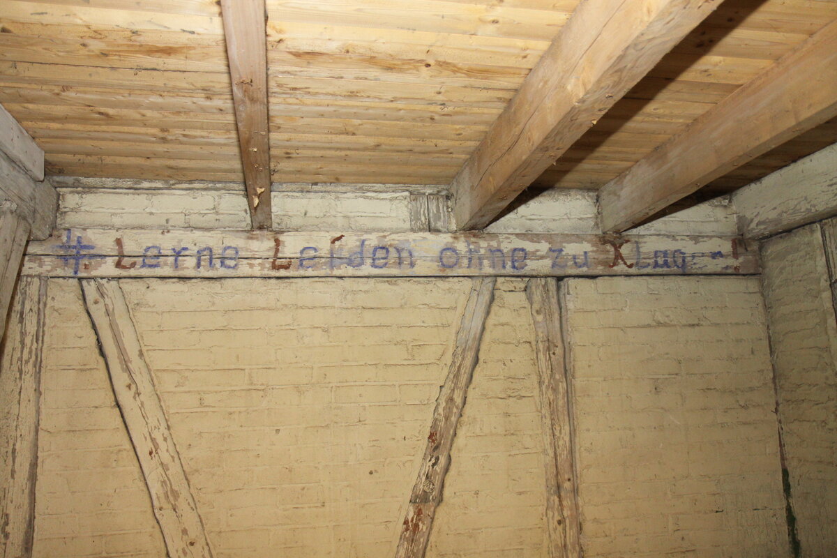 Die Inschrift oberhalb des noch erhaltenen nord-westlichen Kaporaumes stammt aus der Zeit der Nutzung der Scheune als Häftlingsunterkunft und geht auf ein Zitat zurück, das dem Deutschen Kaiser Friedrich III. zugeschrieben wird. Als er den Thron am 9. März 1888 bestieg, war er bereits unheilbar an Kehlkopfkrebs erkrankt, er regierte nur drei Monate. Seinem Sohn und Thronfolger, dem späteren Kaiser Wilhelm II., soll er gesagt haben: